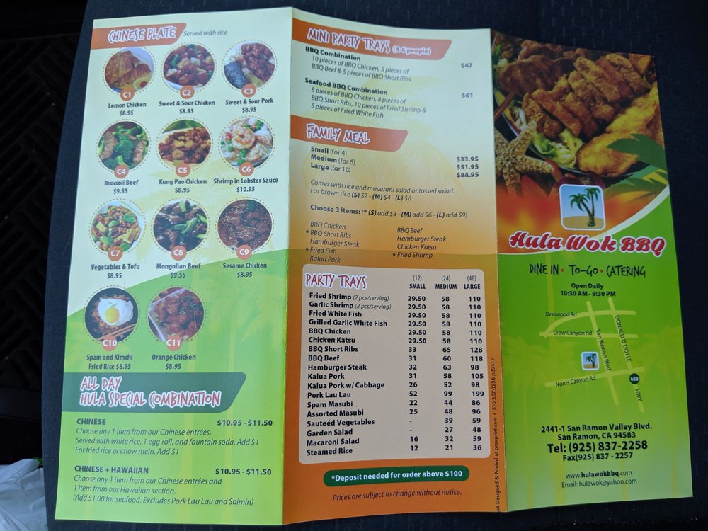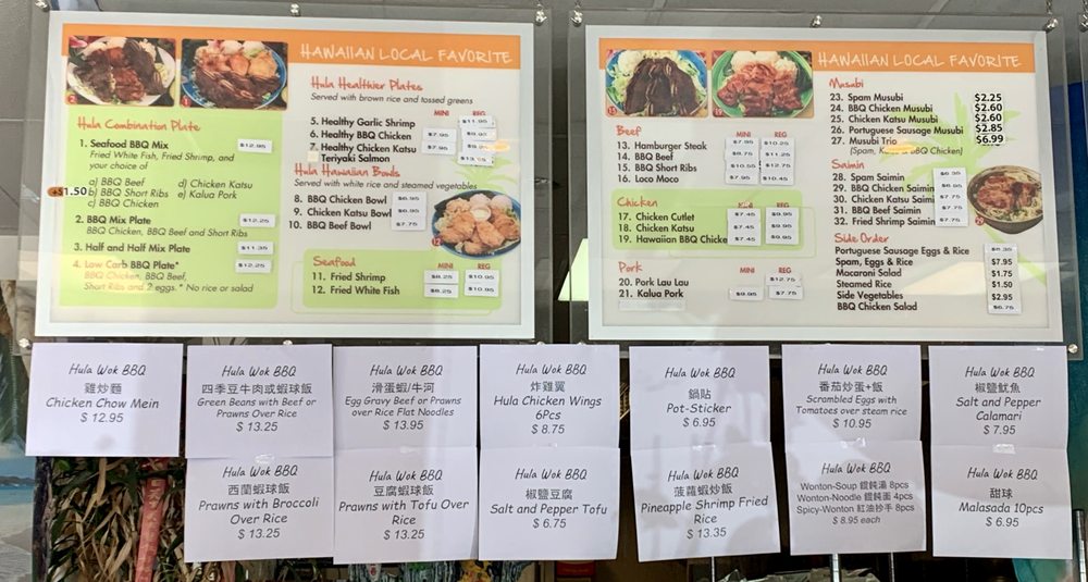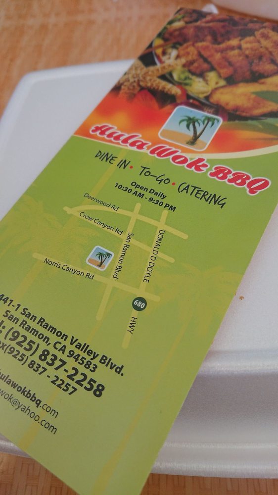 Hula Wok BBQ is a Chinese-Hawaiian-Barbeque fusion restaurant located in San Ramon, CA. This family-owned establishment offers a wide range of options, including takeout, reservations, vegetarian dishes, and catering services. Known for their generous portions and flavorful dishes, customers rave about the salt and pepper calamari, BBQ chicken, spam & kimchi fried rice, loco moco, and chicken katsu musubi. The restaurant has a casual ambiance with outdoor seating, wheelchair accessibility, and ample parking. Visitors appreciate the attentive waiter service, Happy Hour specials, and accommodating staff. Whether you're craving Chinese or Hawaiian cuisine, Hula Wok BBQ is the go-to spot for a satisfying meal with family and friends.